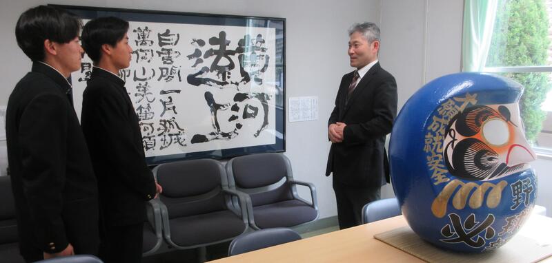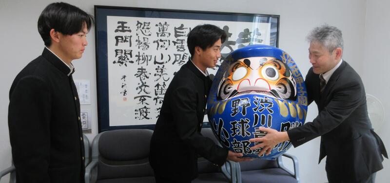 「渋川から甲子園へ」の願いを込めて、青翠色の達磨が校長室から野球部員の元へ手渡されました。スタンドから保護者の方と一緒に部員を見守ってくれます。
