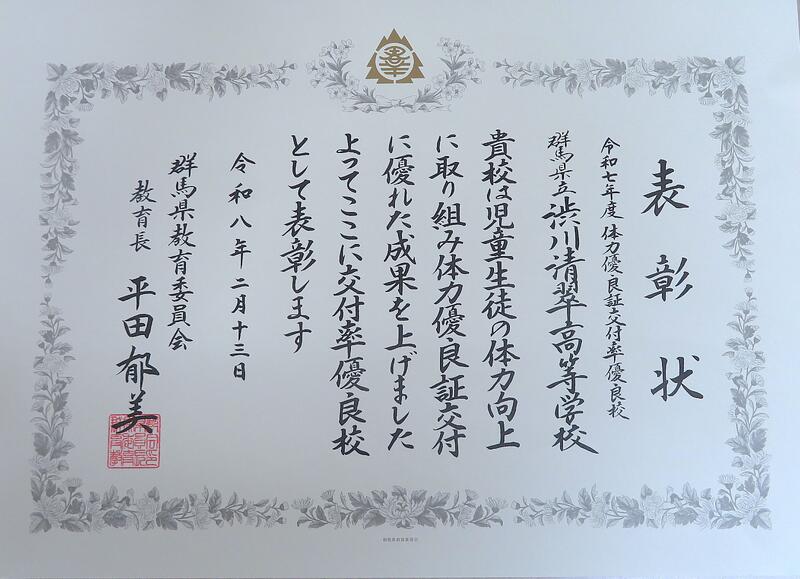 令和7年度の新体力テストの結果から、本校が生徒数300名から599名規模の県内高校の部において、体力優良証の交付率で入賞しました。
